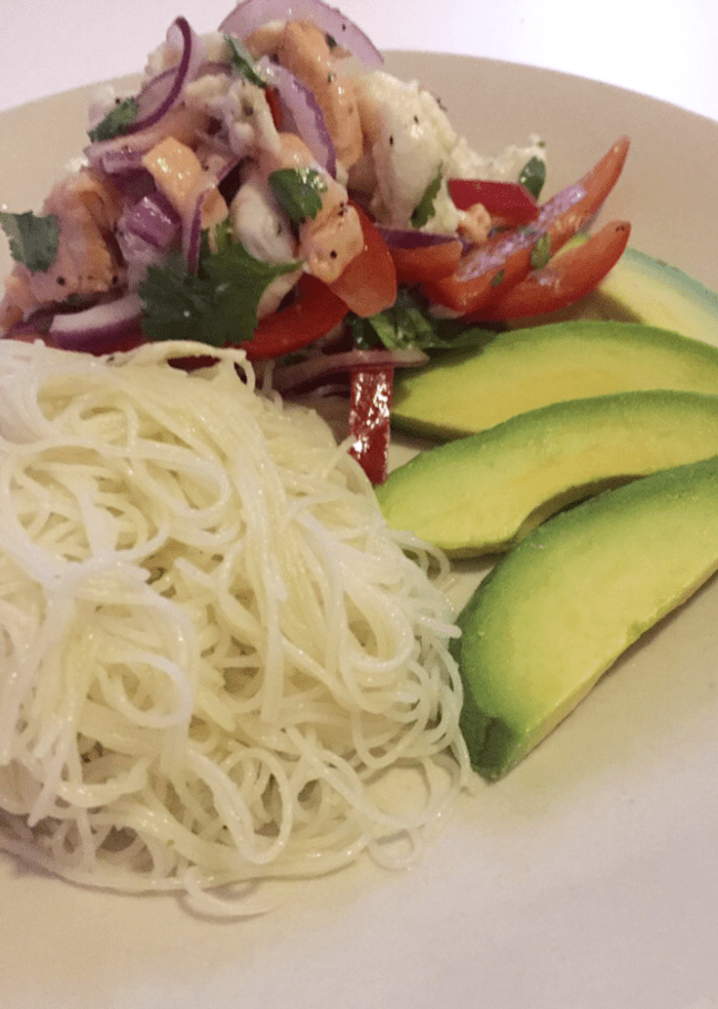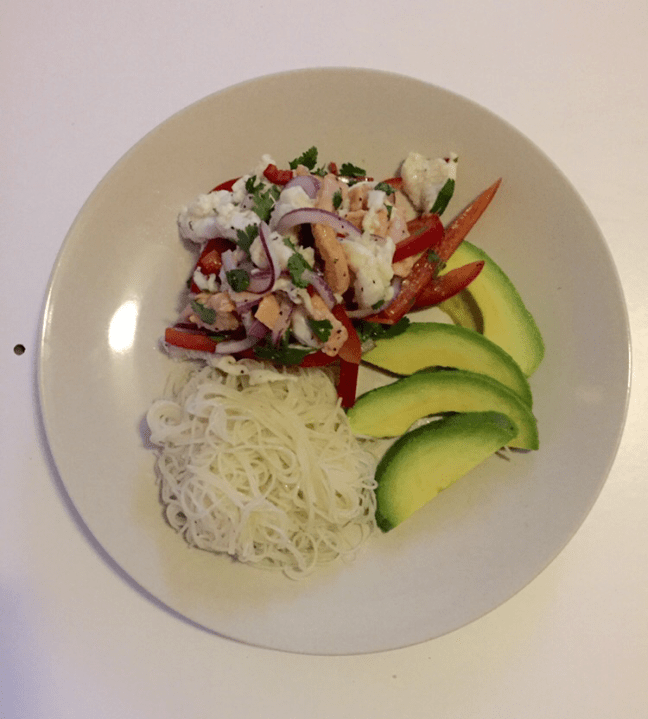 I’ve took the skin off both salmon and lemon sole and cut them up in thin slices. Put it all in a bowl with the juices of 3 or 4 lines, and some chopped up red chilies – I used 2 because I love it! Add chopped up coriander, half of a red onion, a whole red pepper, add a bunch of salt and black pepper. Mix everything up and put it in the fridge for at least 30min. The juices of the line and the chili will cure the fish and that way you’re not eating raw fish – if you are able to get fresh fish and like raw fish, you can cure it for a little at 5min/10min.