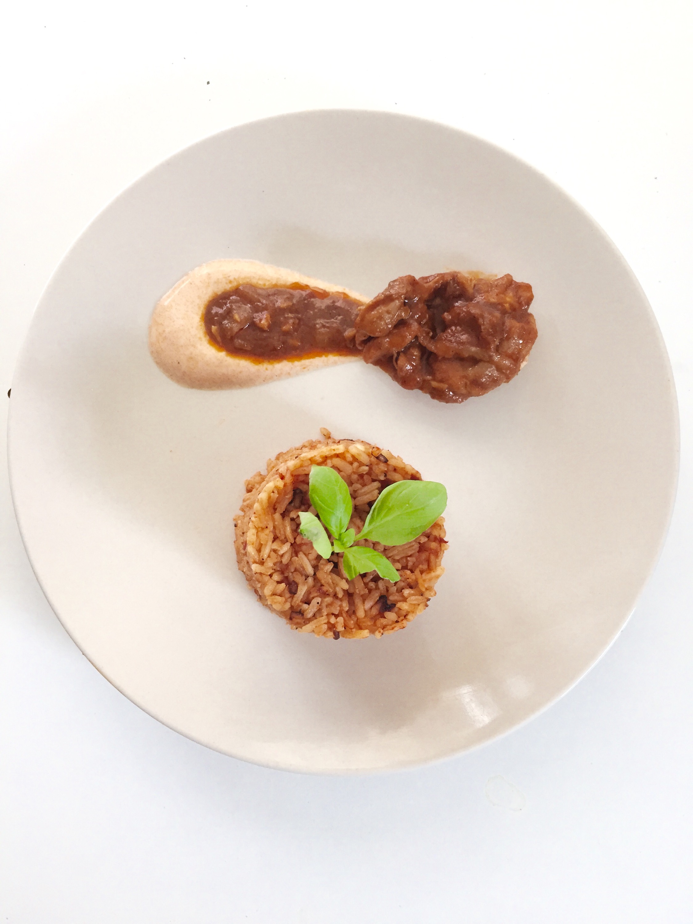 For the Jollof rice, I have fried 1 onion until soft, added 2 tablespoons of tomato purée, 1 teaspoon of cayenne pepper, 1 tablespoon of paprik, some salt and pepper, a little bit over 1.5 cups of chicken stock and when the chicken stock is bubbling away hot, add one cup of long grain rice, and cook if on minimum fire for about 10-15min – make sure you keep an eye on the rice so it doesn’t burn.